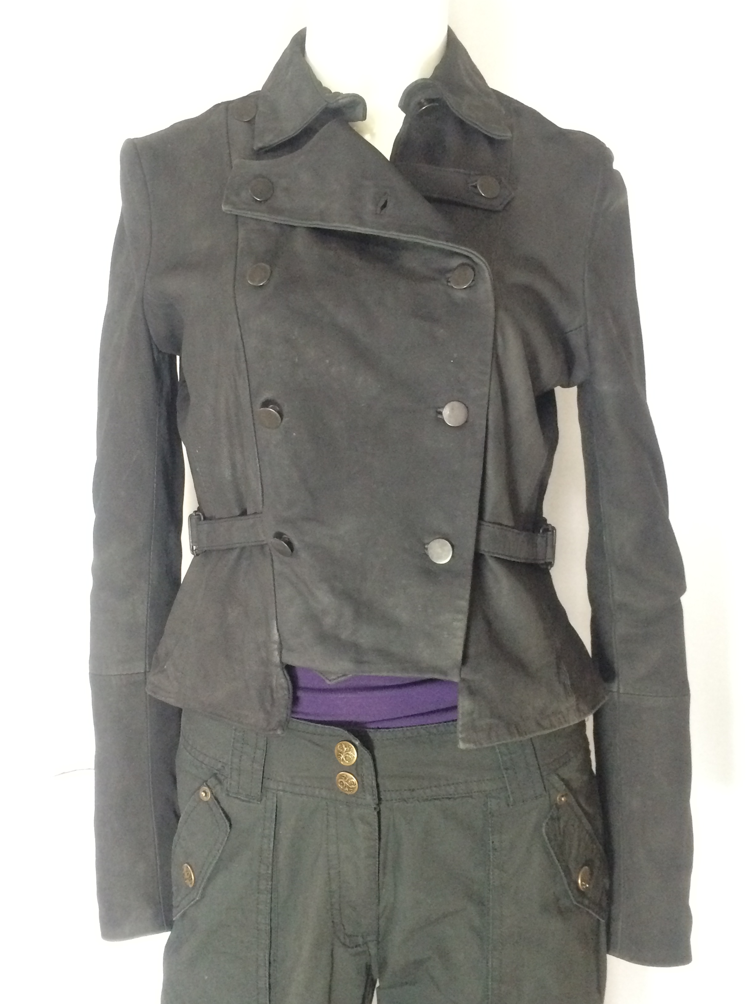 It is a simple costume consisting of a black suede effect military style ‘All Saints’ jacket, a pair of black ‘Dorothy Perkins’ combat trousers anda purple elasticated cotton vest top.